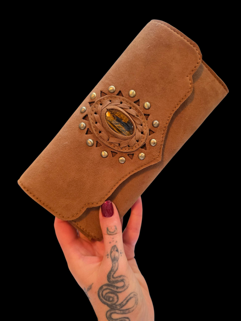 Carry your treasures in style with this elegant Vegan Suede Gemstone Wallet, where practicality meets natural charm. Crafted from soft, cruelty free suede, this wallet offers a luxurious feel without compromising your values. Each piece is adorned with a genuine gemstone accent adding a touch of grounding energy and beauty to your everyday essentials.