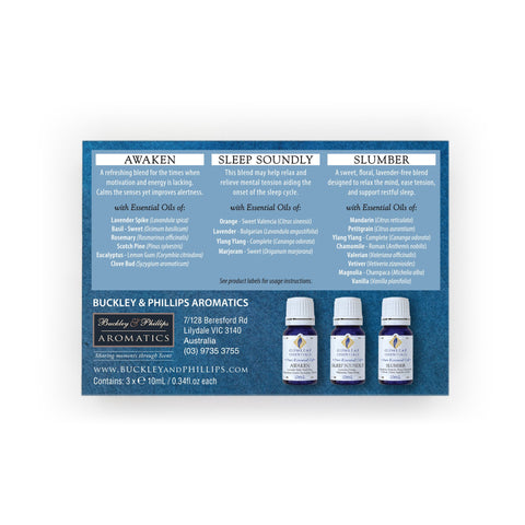 This box set includes three essential oil blends designed for aiding in sleep and wakefulness.