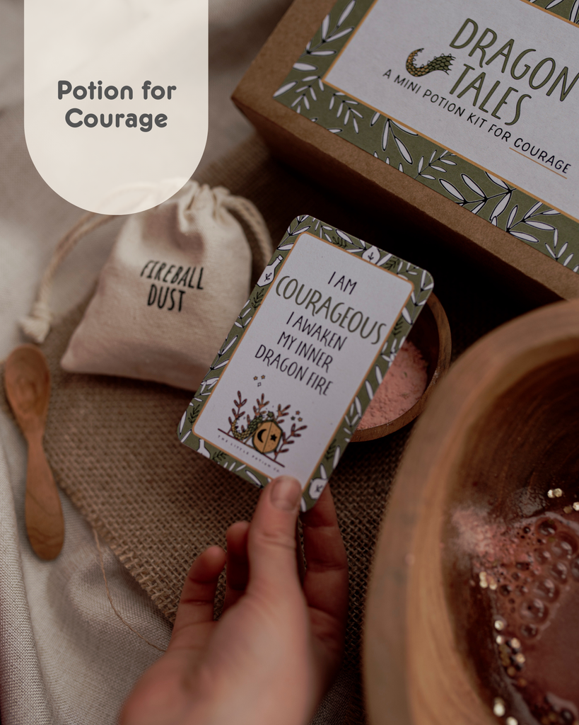 A MINI POTION KIT FOR COURAGE A mini potion kit about dragons and knights. Mix it up and watch it fizz to make potions about being courageous and awakening your inner dragon.