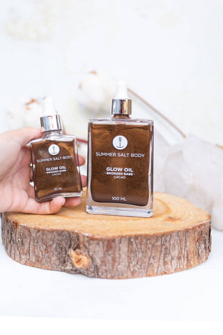 Give your skin an instant glow up with our luxe glow oil. Enriched with coconut oil, grape seed oil, jojoba oil, vitamin e and cocoa butter to hydrate and nourish your skin while leaving you with the lightest chocolate scent. It will give your skin an instant golden glow while offering shimmer and sparkle.