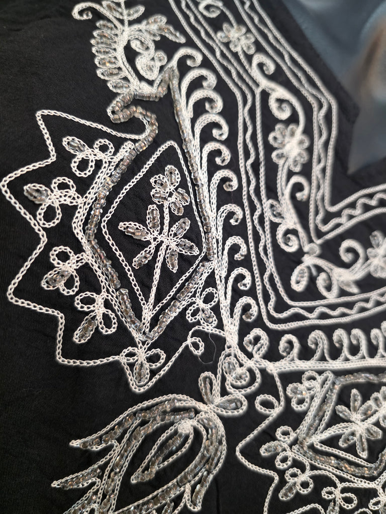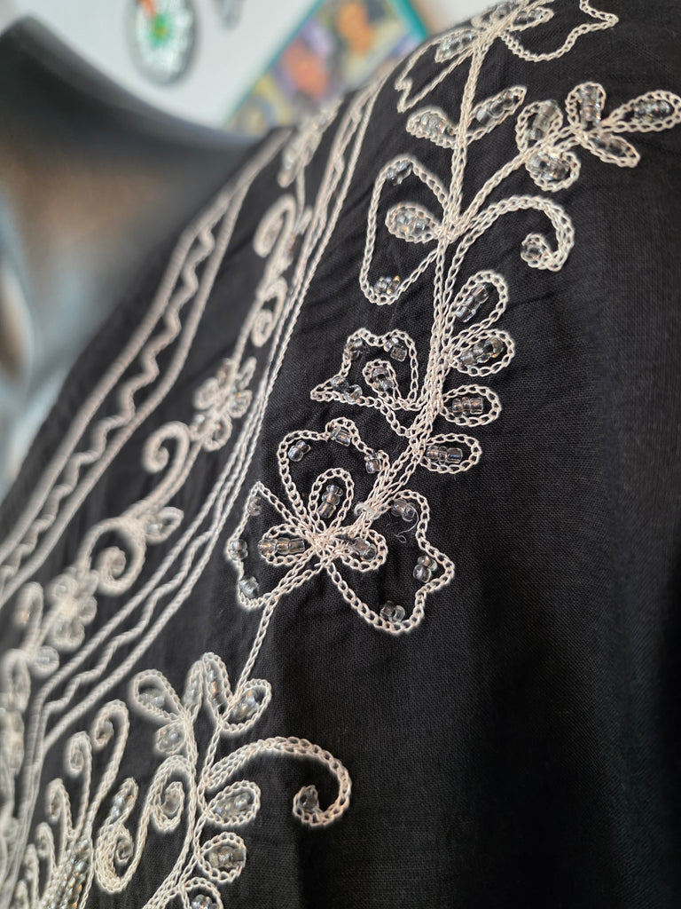 Adorned with intricate beading this lightweight, breathable, and effortlessly versatile, this cotton button up shirt is your go to piece for any season. Perfect as a breezy cover up over swimwear, a relaxed everyday staple.
