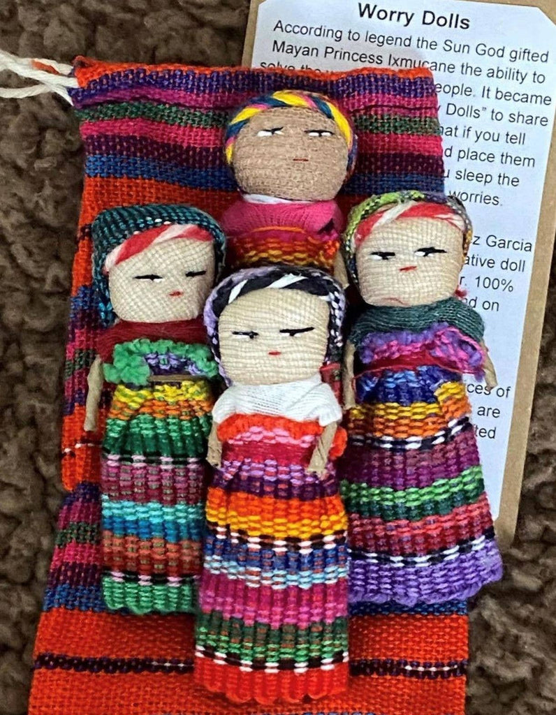 The Worry Doll Legend tells a story that when the Mayan people of Guatemala have worries, they tell them to the worry Dolls and put them under their beds at night. By morning the worry Dolls have taken all the worries away.