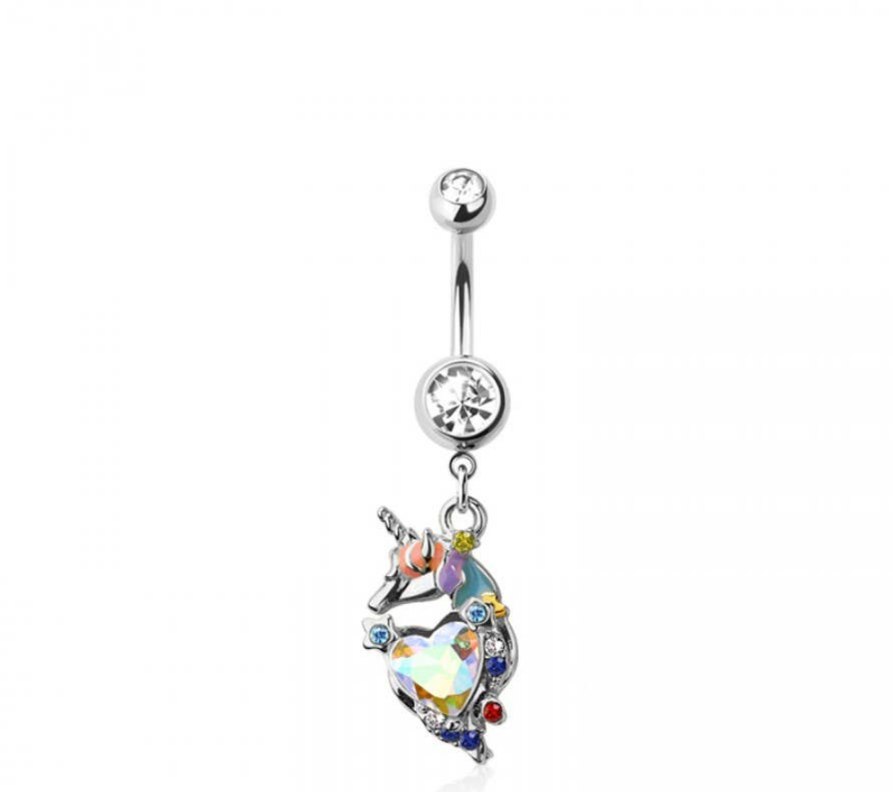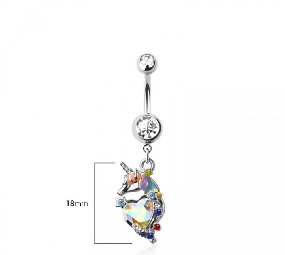 316L SURGICAL STEEL MULTI CZ UNICORN DANGLE BELLY BUTTON NAVEL RING Product Code: NSD-1089 Material: 316L SURGICAL STEEL/Alloy Thickness: 14GA (1.6MM) Length: 3/8" (10MM) SOLD BY PIECE