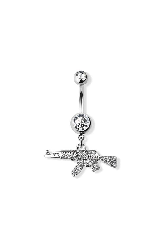 GEM PAVED MACHINE GUN BELLY NAVAL 316L SURGICAL STEEL NAVEL BELLY RING Material: 316L SURGICAL STEEL/BRASS Thickness: 14GA (1.6MM) Length: 3/8" (10MM)