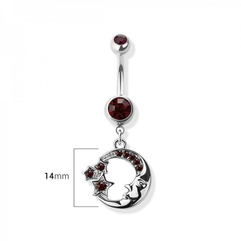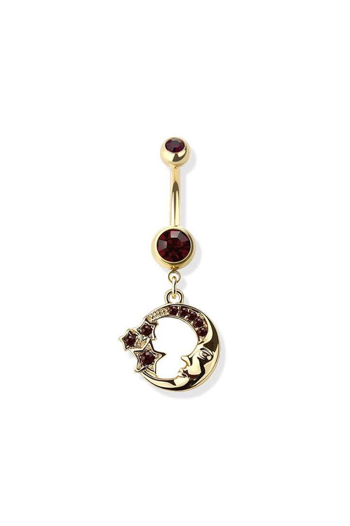 LIL' PURPLE STAR AND MOON DANGLE 316L SURGICAL STEEL NAVEL RING Material: 316L Surgical Steel/Brass Thickness: 14GA (1.6MM) Length: 3/8" (10MM)