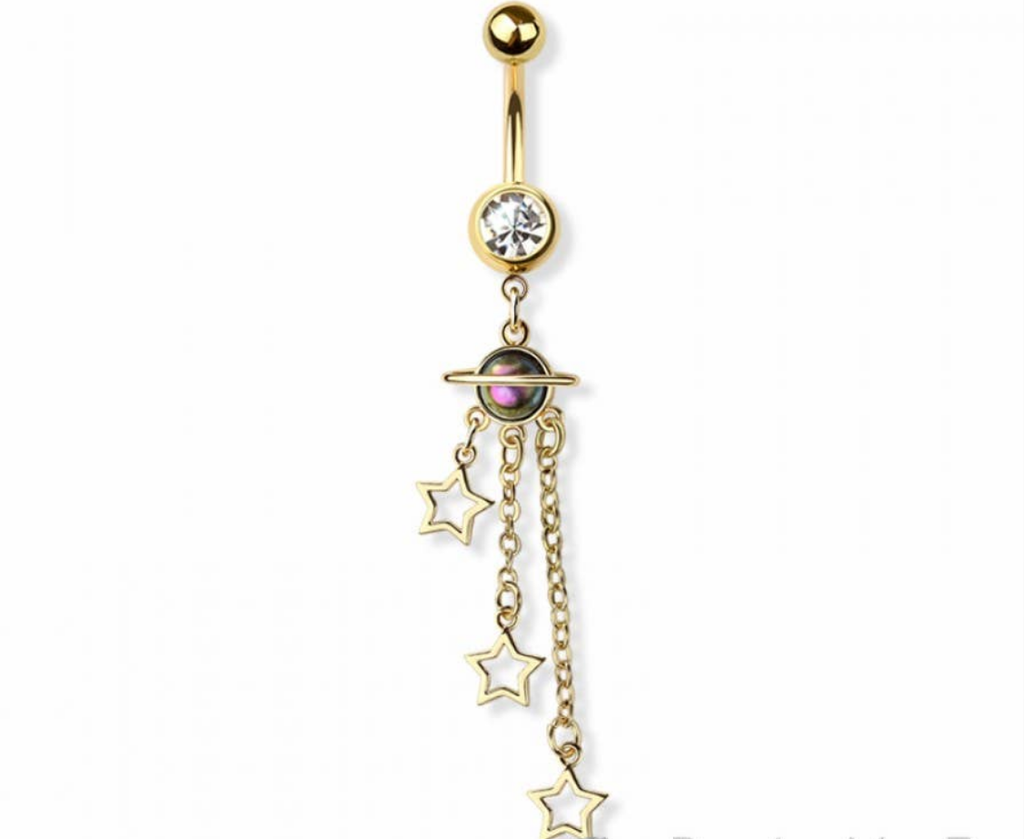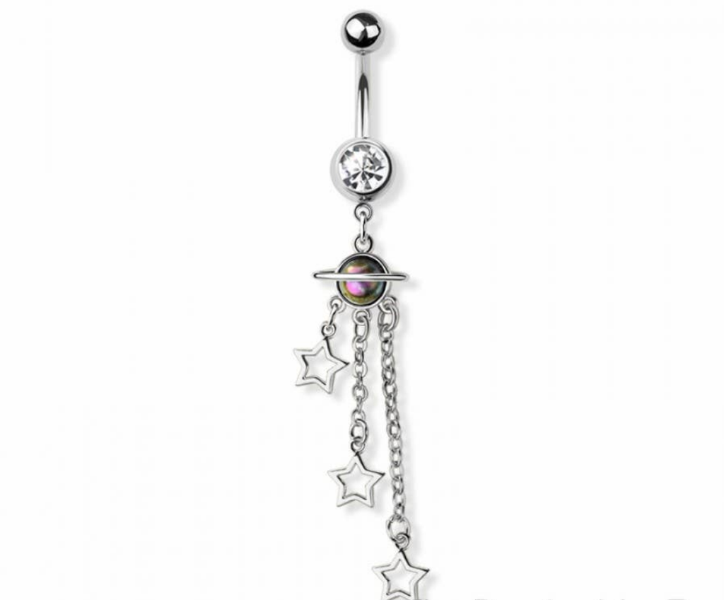 PLANET STAR DANGLE 316L SURGICAL STEEL NAVEL BELLY RING Material: 316L Surgical Steel/Brass Thickness: 14GA (1.6MM) Length: 3/8" (10MM) Ball Size: 5X8MM